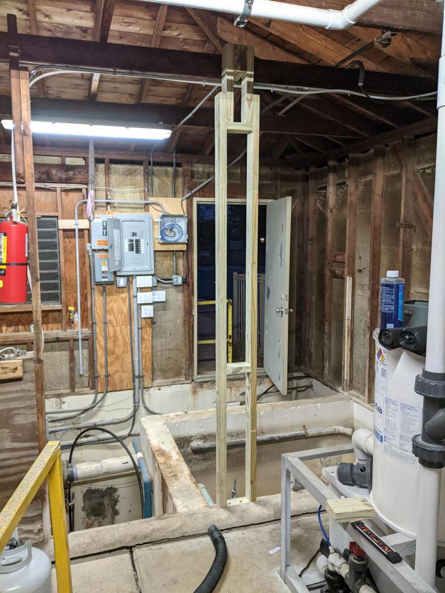 We also hired Lee Contracting for pipe fitting. A large portion of the existing 6-inch patchwork PVC was replaced with a more robust Schedule 80 pipe, adequately secured, and we replaced all associated fixtures and mounts. We corrected issues with a prior installation of copper pipe, then installed new flanges and a butterfly valve (for water diversion to the boiler). We replaced loose-hanging black pipes (slide water feeds) with properly secured copper pipes. A new stainless steel water pump for the slides replaced the old cast iron model.