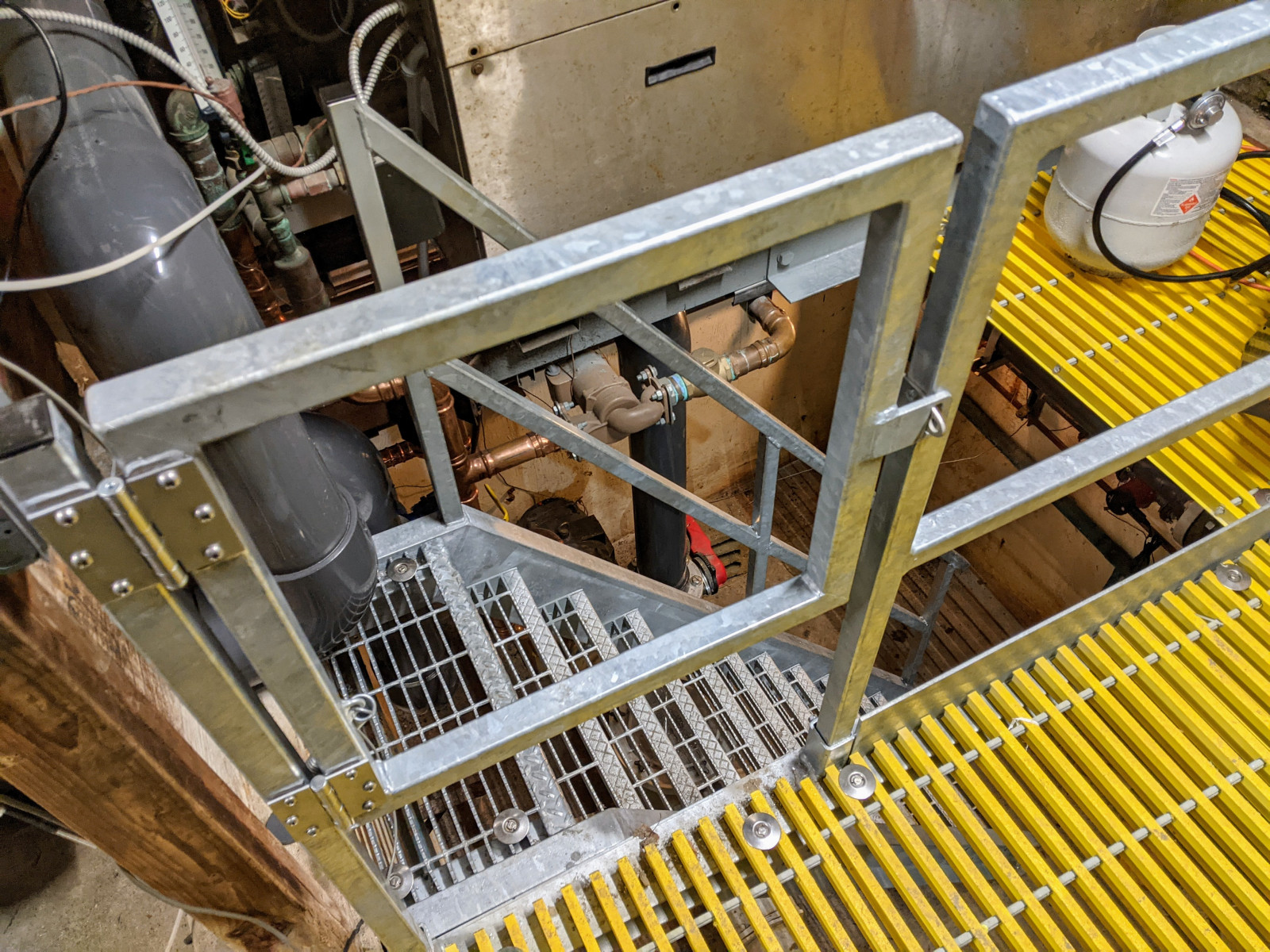 The ship ladder was removed and fully refurbished. The fabrication group added a handrail for safe passage to the lower level. We installed a locking gate and railing adjacent to the stairs to prevent accidental falls to the lower level. All metal surfaces were hot-dip galvanized for long-term resistance to corrosion and rust. A removable grate over the stairs’ end portion provides a boiler maintenance platform.