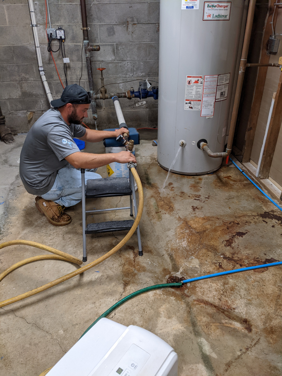 A technician from Aquatic Source is carefully using forced air to push water out of the clubhouse pipes.