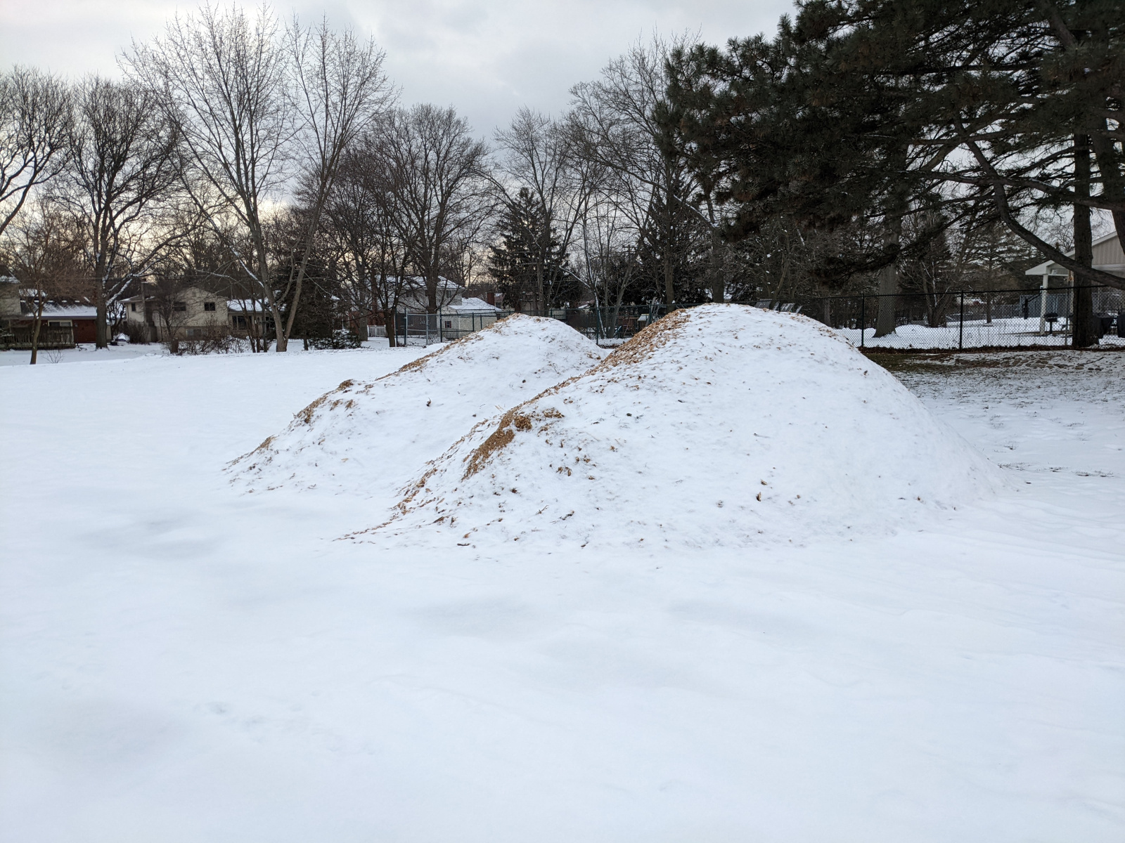 A view of the massive woodchip pile in the parking lot; debris left from the tree removal. These woodchips would eventually be used throughout the property as mulch.