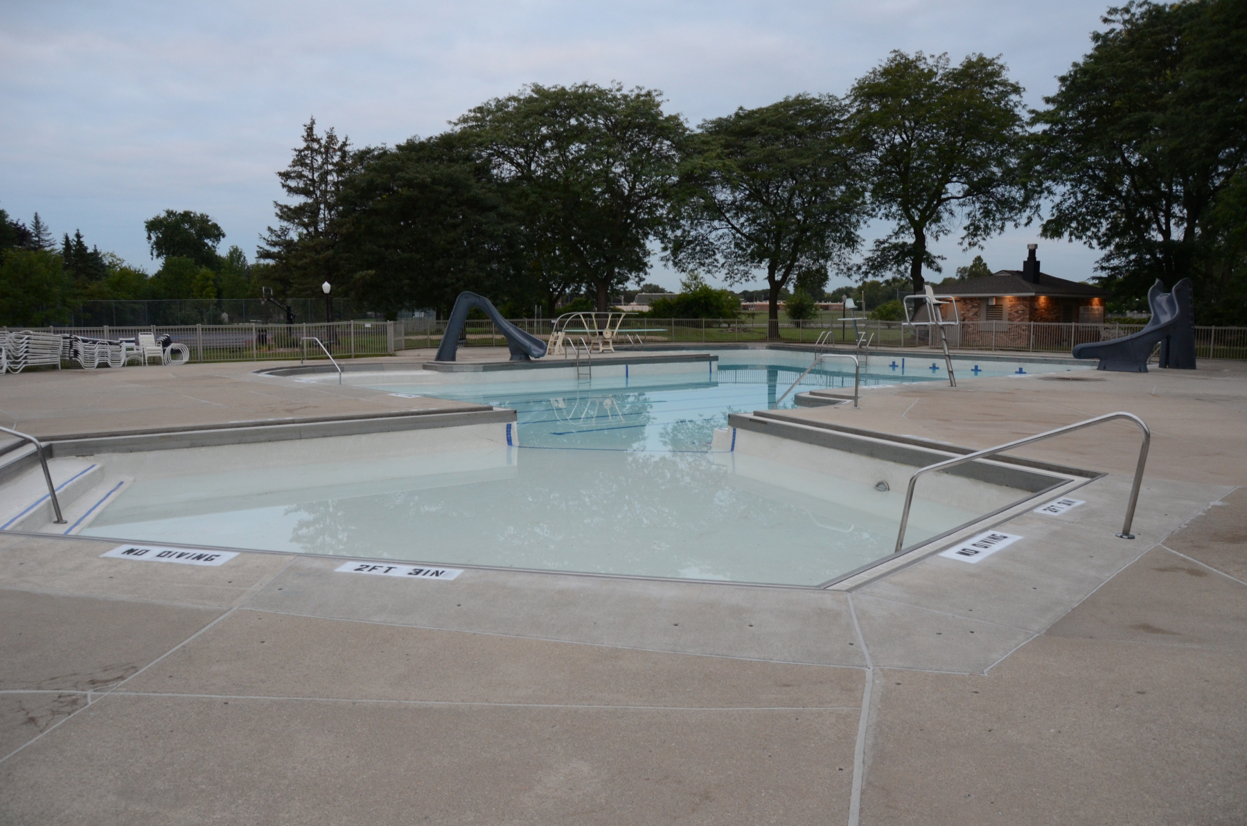 Photos of the existing pool were taken at 7 am, partially drained, before demolition began.