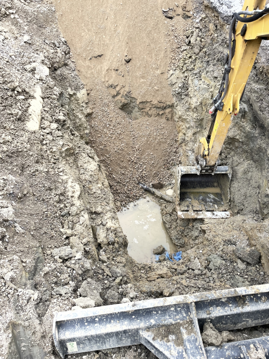 Eventually, we were able to locate and repair the pipe. The water was turned on, and the hole backfilled. Due to the exceptional depth of the hole, extra time to allow for settling (before the parking lot could be resurfaced) was required.