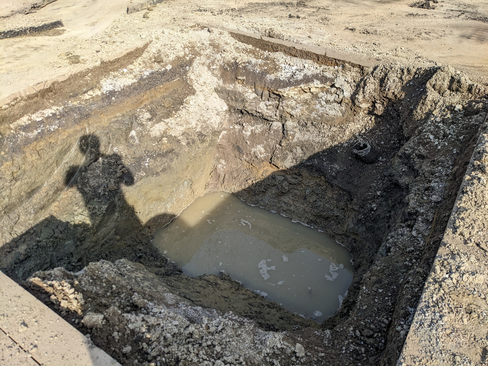From there, the project didn’t go exactly as planned. The pipe we expected to be 5 feet deep was closer to 14 feet deep. The city’s markings (perhaps skewed by the depth of the pipe) were nearly 20 feet off. As a result, far more of the parking lot was removed, and a far bigger mess was made.