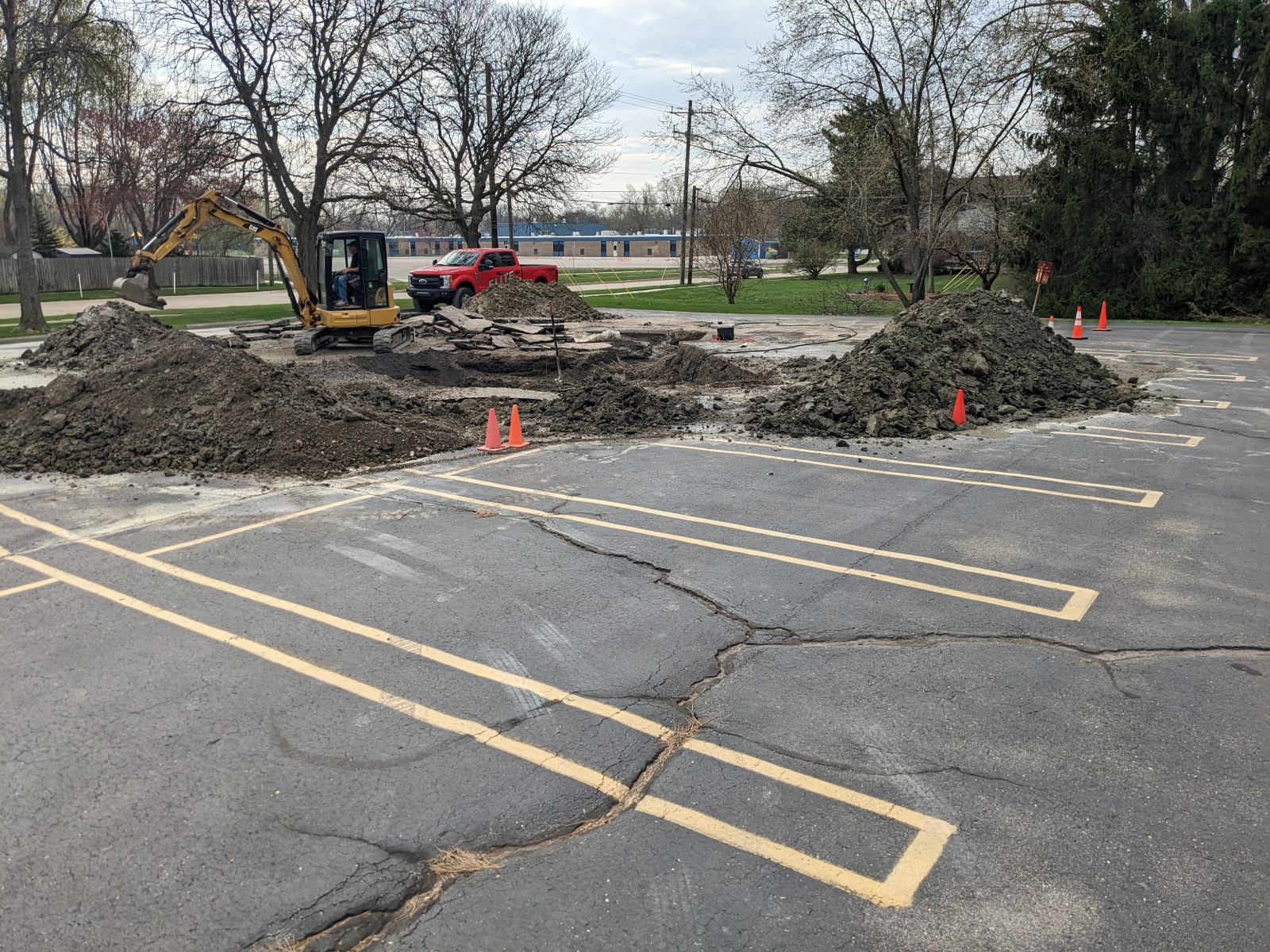 From there, the project didn’t go exactly as planned. The pipe we expected to be 5 feet deep was closer to 14 feet deep. The city’s markings (perhaps skewed by the depth of the pipe) were nearly 20 feet off. As a result, far more of the parking lot was removed, and a far bigger mess was made.