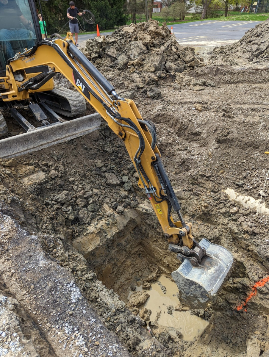 Eventually, we were able to locate and repair the pipe. The water was turned on, and the hole backfilled. Due to the exceptional depth of the hole, extra time to allow for settling (before the parking lot could be resurfaced) was required.