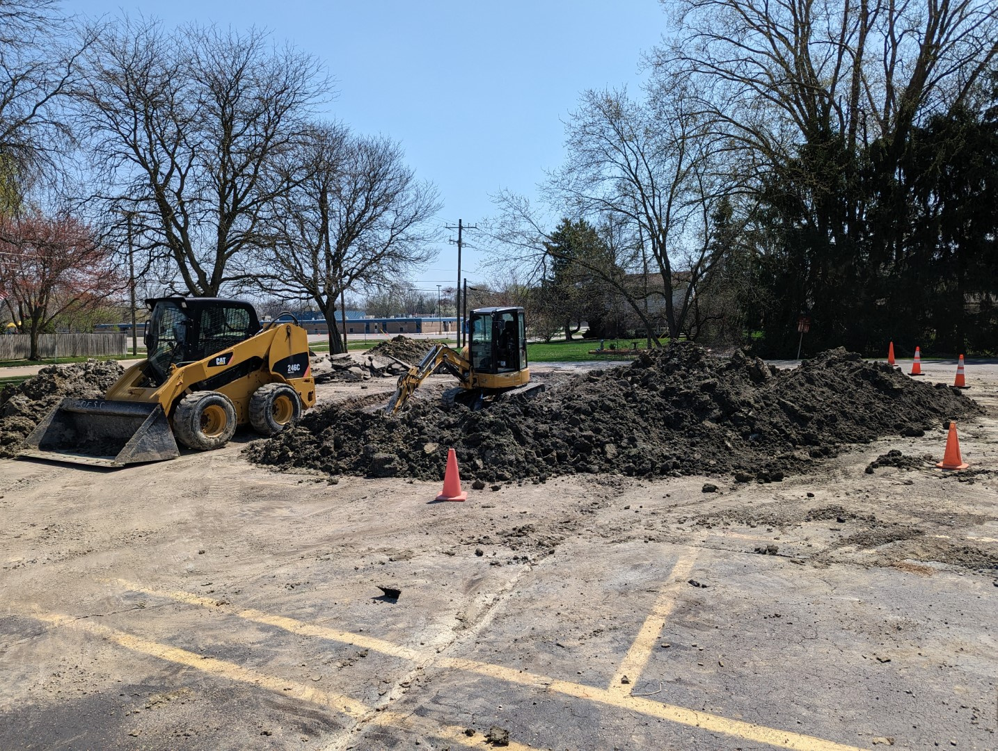 From there, the project didn’t go exactly as planned. The pipe we expected to be 5 feet deep was closer to 14 feet deep. The city’s markings (perhaps skewed by the depth of the pipe) were nearly 20 feet off. As a result, far more of the parking lot was removed, and a far bigger mess was made.