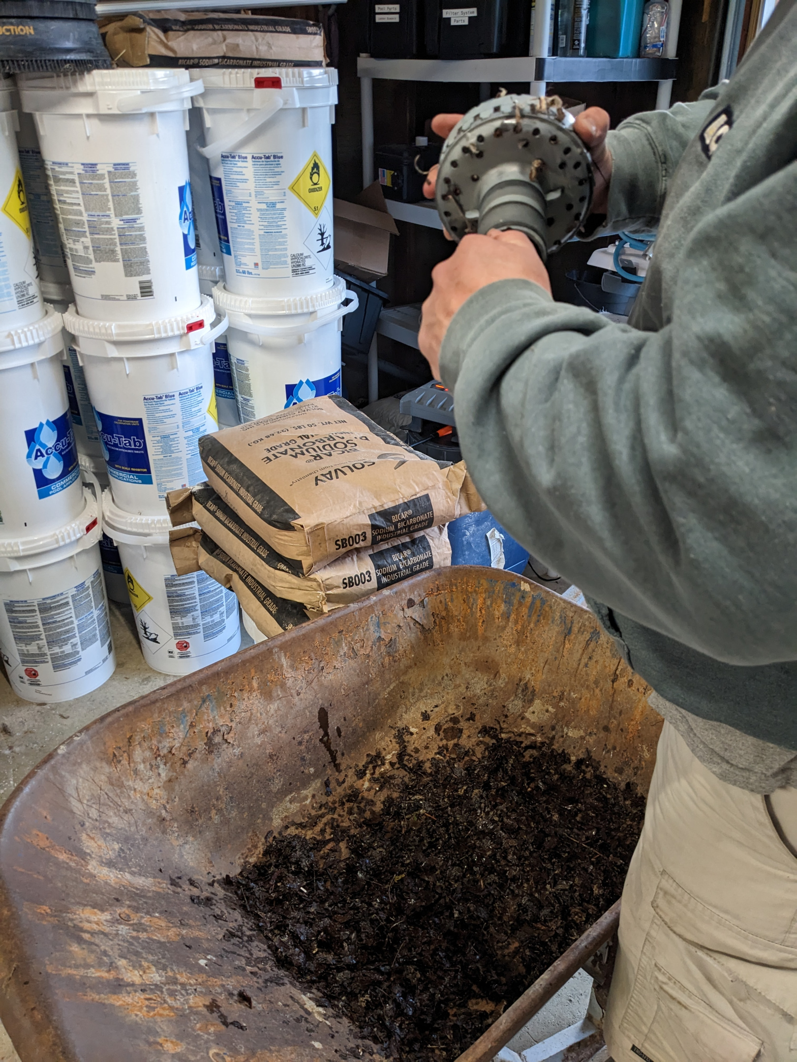 The job involved many hours of manual labor over several days. The sand was removed from the tanks via a custom shop vac and cyclone tank system (thanks, Jason). This was a tedious, messy job. Components were removed and replaced through an impossibly small opening at the top. New sand was hauled and poured into the tanks.