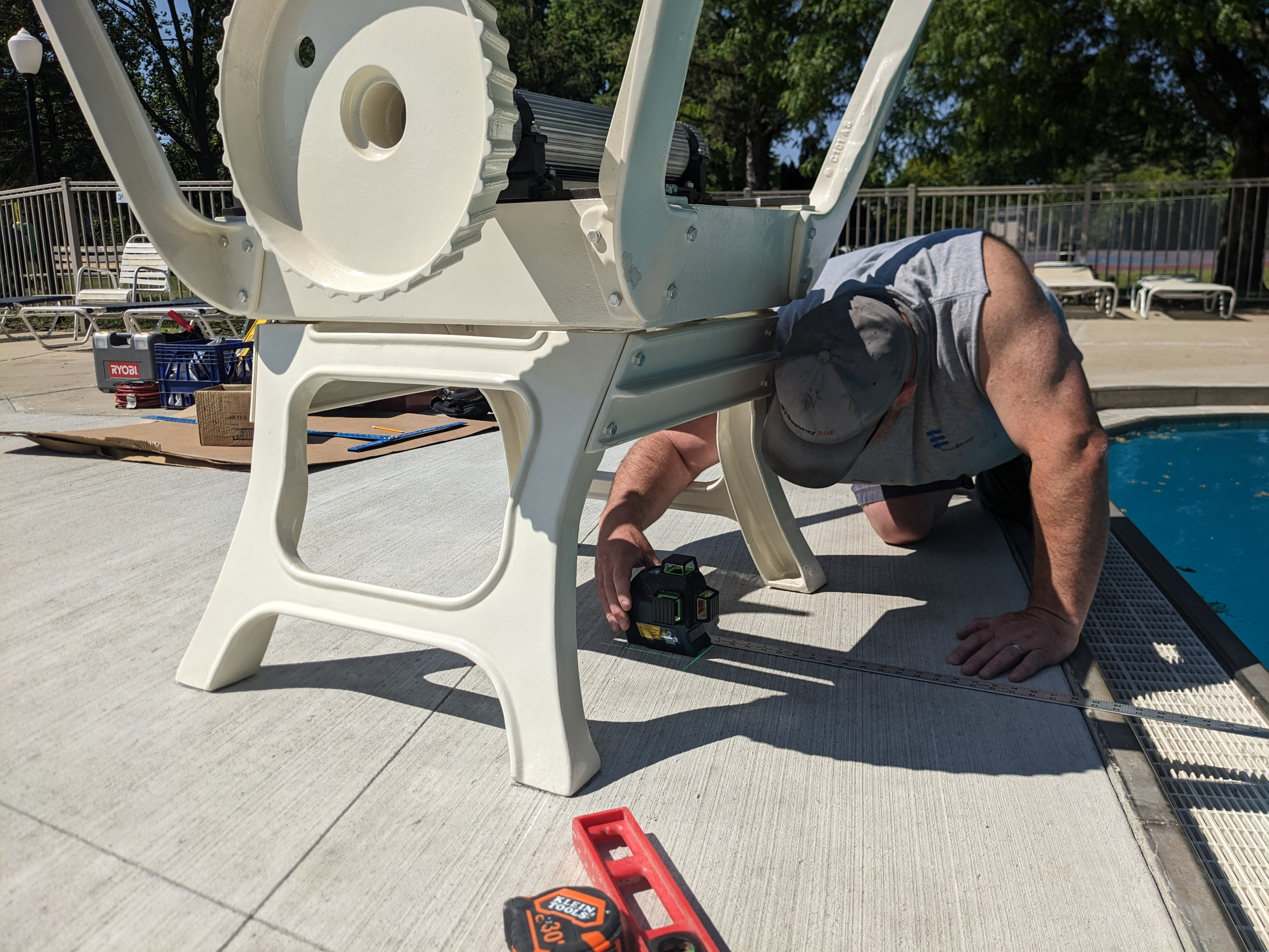 With a new concrete pad in place, we needed to install new mounting rods. Once in place, we painted all aluminum hardware with color-matched touch-up paint to protect the metal from exposure to the pool water.
